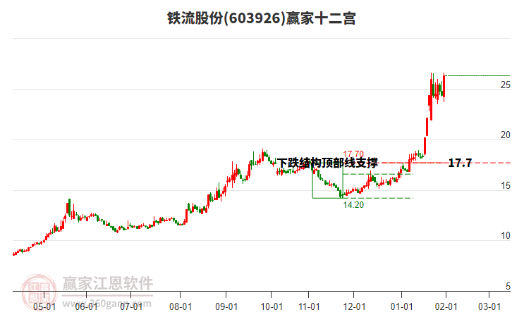 依據贏家江恩系統(tǒng)趨勢工具極反通道分析判斷鐵流股份603926運行在生命線以上強勢區(qū)域,根據規(guī)則該股可短線、波段結合操作;結合物極必反的原理通過分鐘圖做盤中差價,應用口訣是:生命線上強勢走,生命線下難抬頭;紅黃兩條外軌線,壓力支撐顯勢頭。