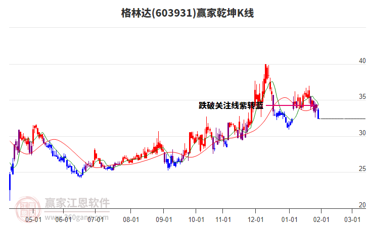 603931格林達(dá)處于贏家江恩多頭中期回調(diào)形態(tài),2月2日發(fā)出中期江恩筑底信號(hào)后,經(jīng)過(guò)3日,今日形成中期筑頂信號(hào),若持續(xù)下跌,觸發(fā)長(zhǎng)期筑頂信號(hào),603931格林達(dá)將轉(zhuǎn)為空頭主線。格林達(dá)今日跳空低開(kāi),截止