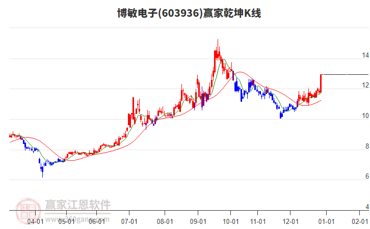 博敏電子(603936)根據贏家江恩極反通道趨勢工具展示,上方壓力位13.4578,下方支撐位11.6586。博敏電子(603936)處于贏家江恩多頭主線形態(tài),1月20日發(fā)出江恩筑頂信號后,經過2日,