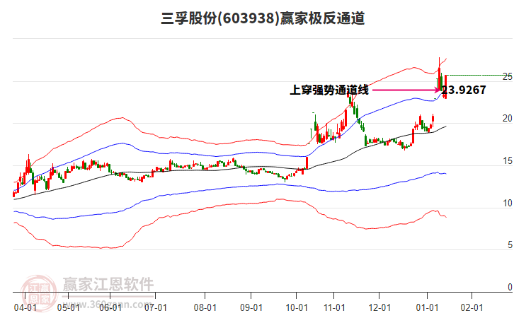當天三孚股份603938最高價28.3上穿了贏家極反通道工具上方紅色外軌線,受到上方紅色外軌線強力壓制,最終收盤停留在在上方紅色外軌線與藍色外軌線上方的超強通道區(qū)域。三孚股份603938近10個交易日