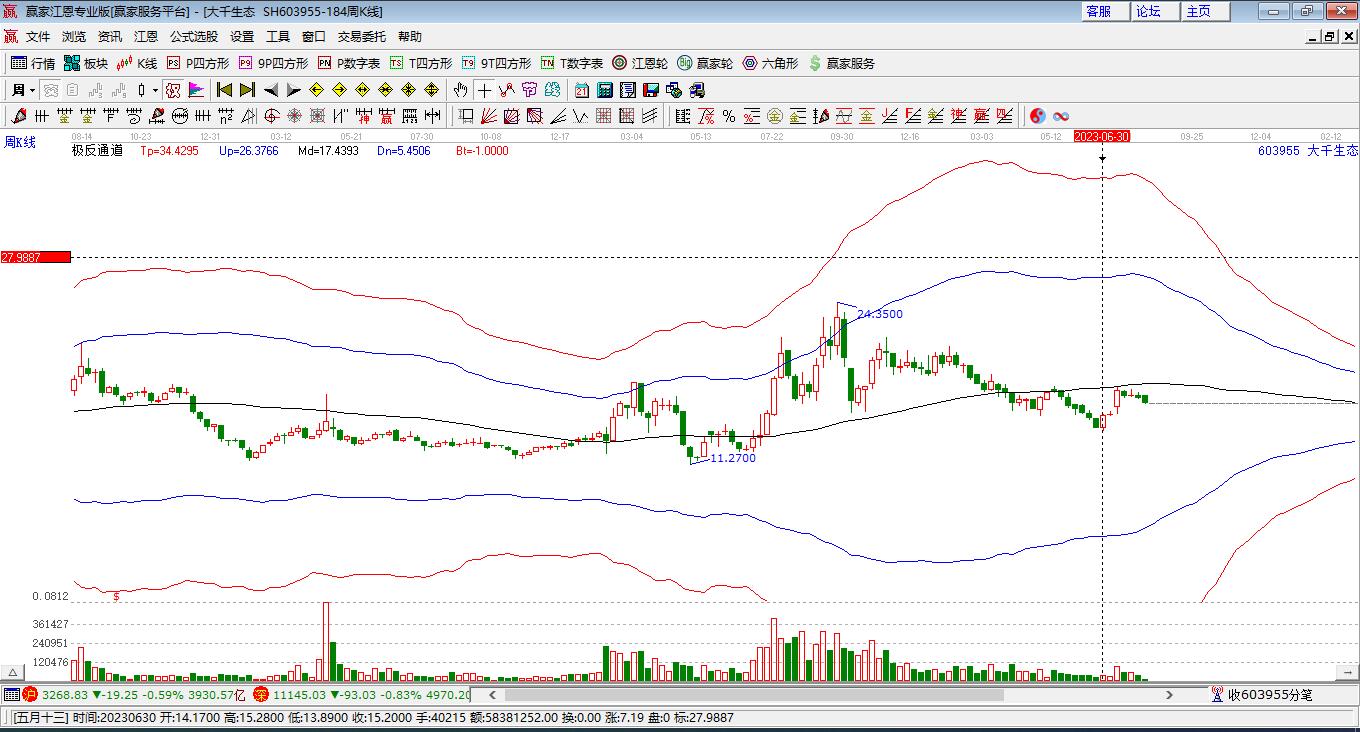 603955大千生態(tài)根據(jù)贏家江恩極反通道趨勢(shì)工具展示,上方壓力位30.7949,下方支撐位24.652。603955大千生態(tài)處于贏家江恩多頭中期回調(diào)形態(tài),今日雖重心下移,但短期多頭趨勢(shì)未改變,從8月1