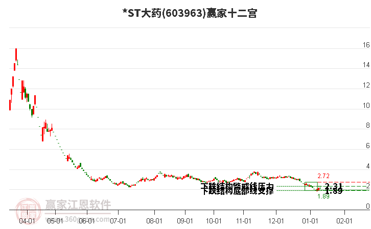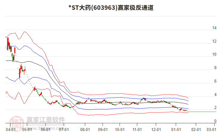 依據(jù)贏家江恩系統(tǒng)趨勢工具極反通道分析判斷*ST大藥603963運行在生命線以下弱勢區(qū)域,根據(jù)規(guī)則該股短線輕倉參與,股價跌至弱勢外軌線后波段再結(jié)合其它工具信號建倉。應(yīng)用口訣是:生命線上強勢走,生命線下難抬頭;紅黃兩條外軌線,壓力支撐顯勢頭。