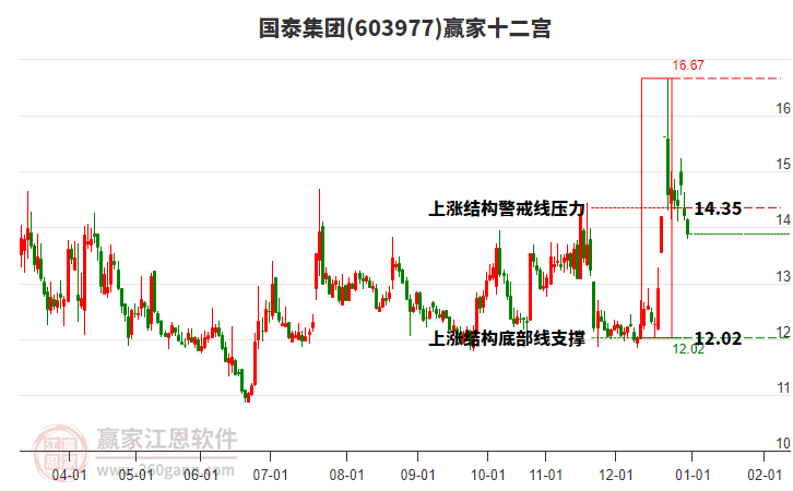 國(guó)泰集團(tuán)處于贏家江恩多頭主線形態(tài),從1月6日形成底分型后持續(xù)上攻,今日突破前高形成初次江恩筑底信號(hào),中長(zhǎng)期多頭趨勢(shì)依舊保持。國(guó)泰集團(tuán)根據(jù)贏家江恩極反通道趨勢(shì)工具展示,上方壓力位15.5503,下方支撐