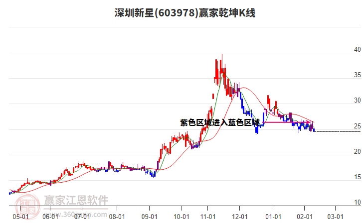 603978深圳新星在高點(diǎn)31.71后,回調(diào)了6.25元,目前處于下跌趨勢(shì)