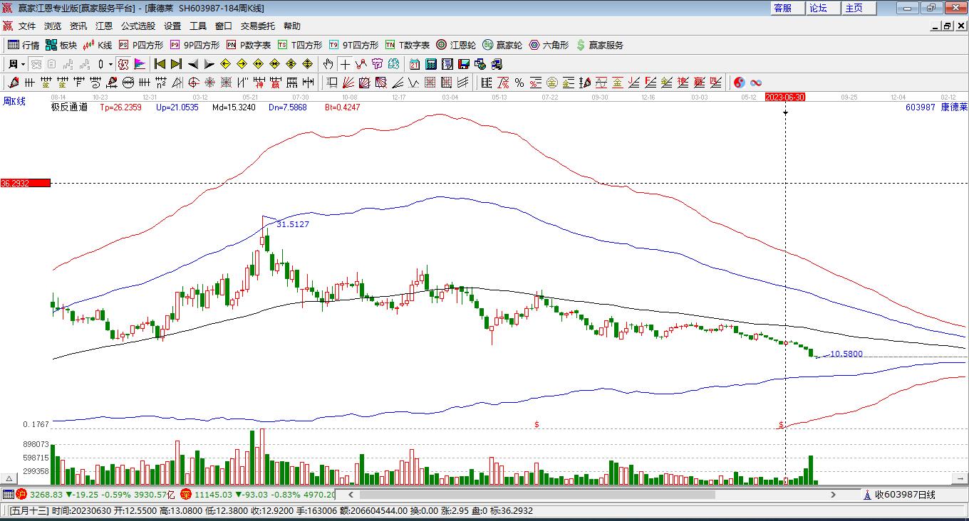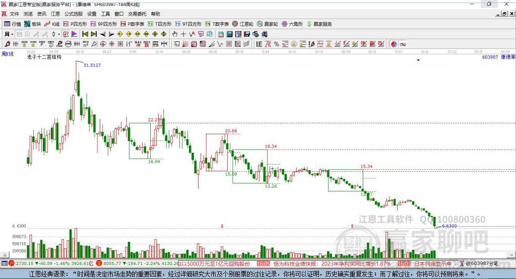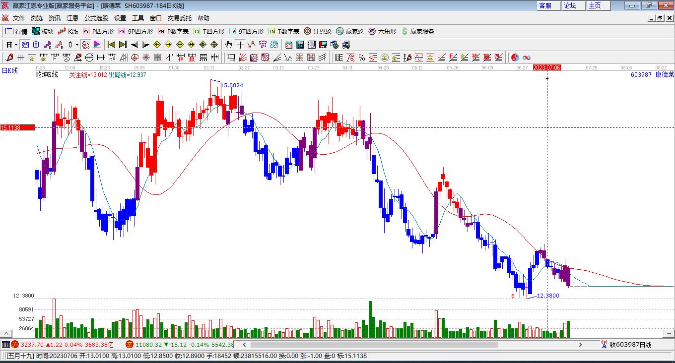 康德萊(603987)處于贏家江恩多頭中期回調(diào)形態(tài),12月10日發(fā)出江恩筑頂信號后,經(jīng)過26日,今日再次發(fā)出江恩底分型并發(fā)出江恩筑底信號,中期多頭反彈趨勢延續(xù),但長期處于回調(diào)中??档氯R今日高開0.02