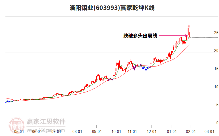 洛陽(yáng)鉬業(yè)根據(jù)贏家江恩極反通道趨勢(shì)工具展示,上方壓力位24.222,下方支撐位20.1367。洛陽(yáng)鉬業(yè)處于贏家江恩多頭次主線形態(tài),從1月29日形成頂分型后持續(xù)下跌,重心下移,今日跌破前低形成短期初次筑頂