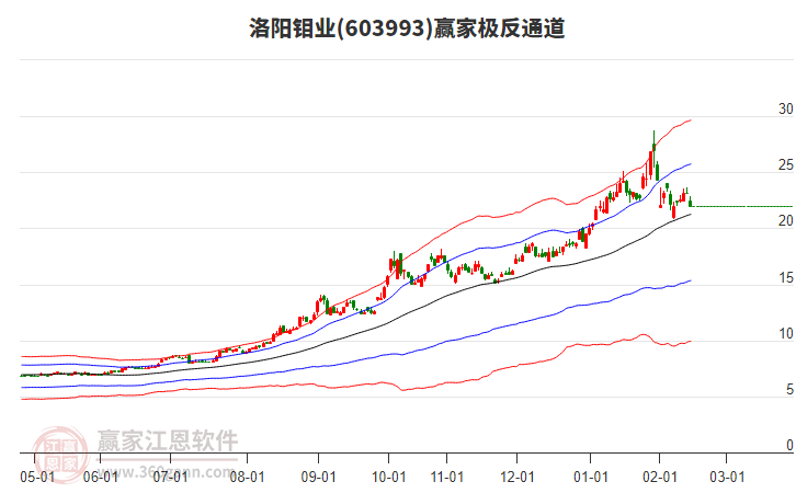 周四洛陽(yáng)鉬業(yè)603993最高價(jià)24.55上穿了贏家極反通道工具上方紅色外軌線,受到上方紅色外軌線強(qiáng)力壓制,最終收盤停留在在上方紅色外軌線與藍(lán)色外軌線上方的超強(qiáng)通道區(qū)域。洛陽(yáng)鉬業(yè)603993近10個(gè)交易