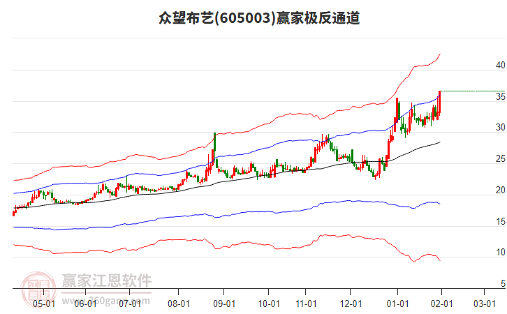 眾望布藝(605003)低開收上下影大陽線,今日收盤價(jià)為32.52
