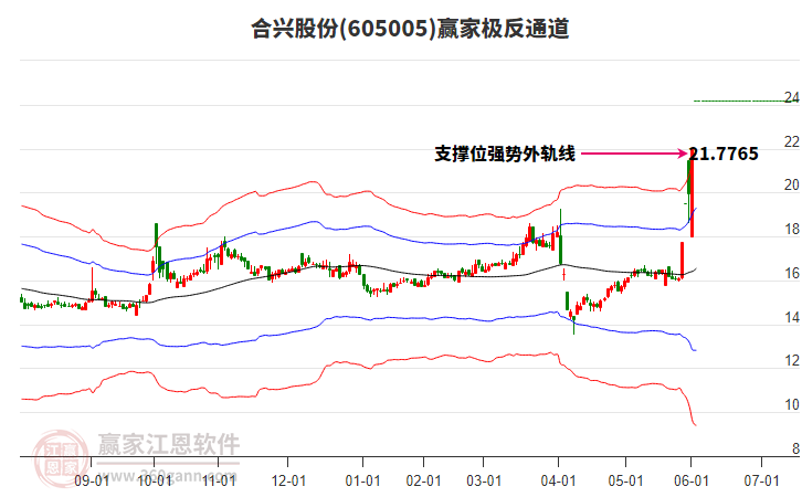 依據(jù)贏家江恩系統(tǒng)趨勢(shì)工具極反通道分析判斷合興股份605005運(yùn)行在生命線以下弱勢(shì)區(qū)域,根據(jù)規(guī)則該股短線輕倉(cāng)參與,股價(jià)跌至弱勢(shì)外軌線后波段再結(jié)合其它工具信號(hào)建倉(cāng)。應(yīng)用口訣是:生命線上強(qiáng)勢(shì)走,生命線下難抬頭;紅黃兩條外軌線,壓力支撐顯勢(shì)頭。