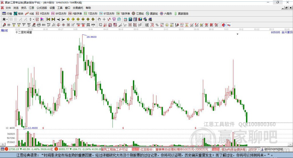 605005合興股份處于贏家江恩多頭主線形態(tài),1月7日發(fā)出江恩筑頂信號后,經過23日,今日再次發(fā)出江恩底分型并發(fā)出江恩筑底信號,中長期多頭趨勢依舊保持。合興股份今日跳空低開,目前K線呈現(xiàn)下影陽十字星,