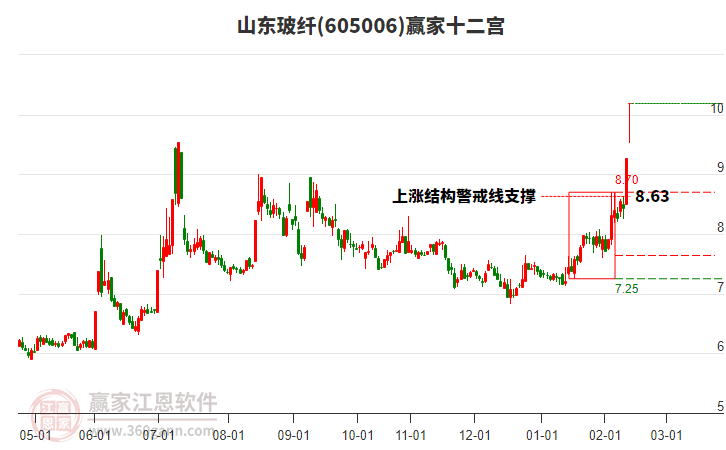 山東玻纖605006漲至老子十二宮下跌結(jié)構(gòu)警戒線上方區(qū)域附近 近22個(gè)交易日漲幅27.51%