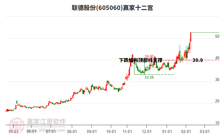 2月13日走勢完成上漲結(jié)構(gòu),今日股價以59.18收盤,小幅下跌3.3%,股價自近期低點漲至今日,共上漲24.38元,漲幅70.06%,依據(jù)贏家十二宮能量守恒規(guī)則,上漲結(jié)構(gòu)的形成往往意味著短期上漲能量出現(xiàn)衰竭點 。當(dāng)前股價若能有效突破站穩(wěn)上漲結(jié)構(gòu)頂部線,后市有望繼續(xù)走高,若不能站上頂部線,則后市將會向下至警戒線附近尋找新的支撐。