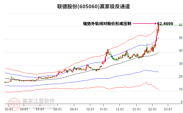 當(dāng)天605060聯(lián)德股份最高價63.4上穿了贏家極反通道工具上方紅色外軌線,受到上方紅色外軌線強力壓制,最終收盤停留在在上方紅色外軌線與藍色外軌線上方的超強通道區(qū)域。605060聯(lián)德股份近10個交易日