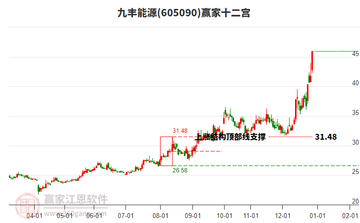 1月12日九豐能源605090最高價51.32挑戰(zhàn)了贏家極反通道工具上方紅色外軌線,受到上方紅色外軌線強(qiáng)力壓制,最終收盤停留在在上方紅色外軌線與藍(lán)色外軌線上方的超強(qiáng)通道區(qū)域。九豐能源605090近10