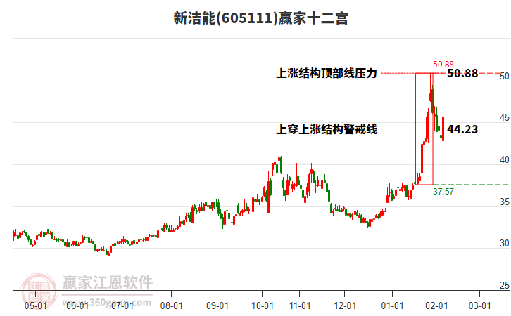 該股自近期低點(diǎn)41.47,漲至今日47.15,共上漲5.68元,漲幅13.7%,當(dāng)前股價處于2026年1月29日形成的上漲結(jié)構(gòu)頂部線與警戒線之間。依據(jù)贏家十二宮多空能量守恒規(guī)則,若多方能量再度聚集發(fā)力上攻,有望繼續(xù)上攻關(guān)注結(jié)構(gòu)頂部線50.88尋找平衡位。
