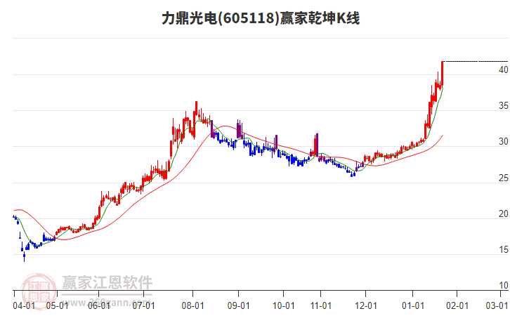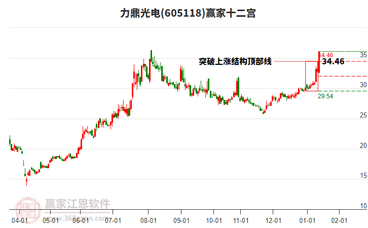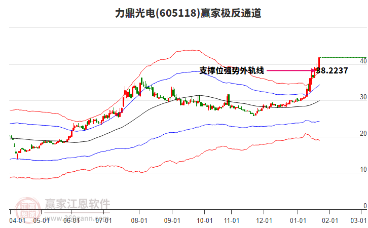依據(jù)贏家江恩系統(tǒng)趨勢(shì)工具極反通道分析判斷力鼎光電605118運(yùn)行在生命線以上強(qiáng)勢(shì)區(qū)域,根據(jù)規(guī)則該股可短線、波段結(jié)合操作;結(jié)合物極必反的原理通過分鐘圖做盤中差價(jià),應(yīng)用口訣是:生命線上強(qiáng)勢(shì)走,生命線下難抬頭;紅黃兩條外軌線,壓力支撐顯勢(shì)頭。