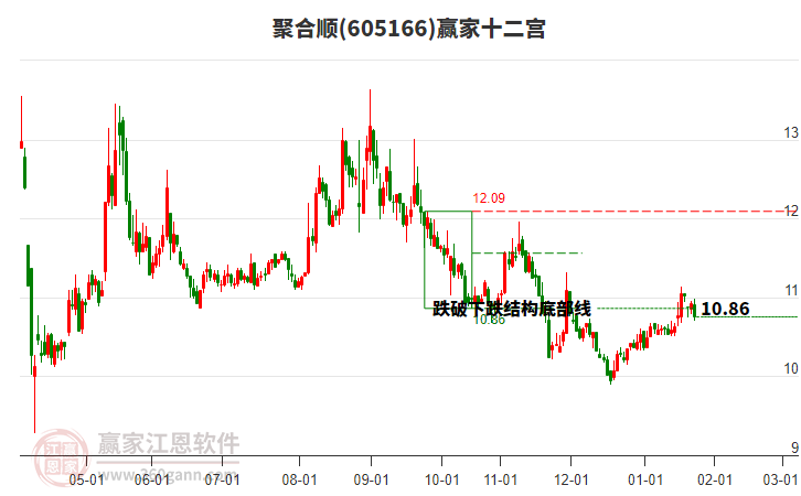 2月13日股價處于2025年10月21日形成的下跌結(jié)構(gòu)底部線10.86上方區(qū)域,該股自近期高點11.36跌至今日10.89,跌幅4.32%。依據(jù)贏家十二宮多空能量守恒規(guī)則,若股價不能有效站穩(wěn)底部線,下方多空能量平衡位需結(jié)合前方贏家十二宮結(jié)構(gòu)尋找。