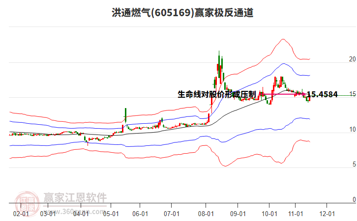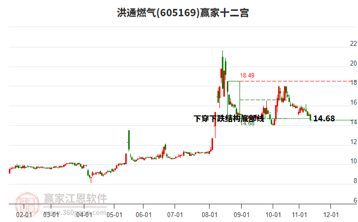 洪通燃?xì)馓幱谮A家江恩多頭中期回調(diào)形態(tài),今日重心持續(xù)下移,短期延續(xù)下跌趨勢(shì),從10月20日形成中期頂分型后中期重心持續(xù)下移,今日跌破前低形成初次筑頂信號(hào),長(zhǎng)期處于多頭回調(diào)趨勢(shì)。洪通燃?xì)猱?dāng)天K線以下影小陰