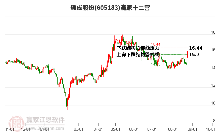 確成股份(605183)處于贏家江恩多頭次主線形態(tài),從11月17日形成頂分型后持續(xù)下跌,重心下移,今日跌破前低形成短期初次筑頂信號,短期多頭趨勢已被破壞,中長期目前都處于回調(diào)中。確成股份今日跳空低開,