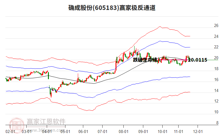 依據(jù)贏家江恩系統(tǒng)趨勢工具極反通道分析判斷確成股份605183運行在生命線以下弱勢區(qū)域,根據(jù)規(guī)則該股短線輕倉參與,股價跌至弱勢外軌線后波段再結(jié)合其它工具信號建倉。應(yīng)用口訣是:生命線上強勢走,生命線下難抬頭;紅黃兩條外軌線,壓力支撐顯勢頭。