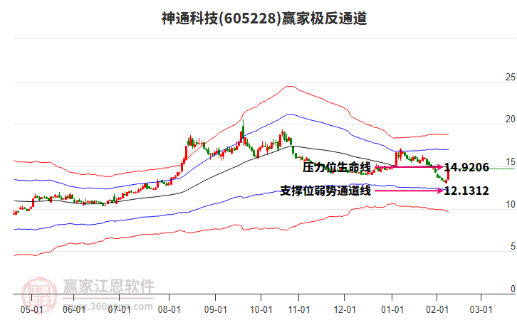 依據(jù)贏家江恩系統(tǒng)趨勢工具極反通道分析判斷神通科技605228運行在生命線以上強勢區(qū)域,根據(jù)規(guī)則該股可短線、波段結(jié)合操作;結(jié)合物極必反的原理通過分鐘圖做盤中差價,應用口訣是:生命線上強勢走,生命線下難抬頭;紅黃兩條外軌線,壓力支撐顯勢頭。