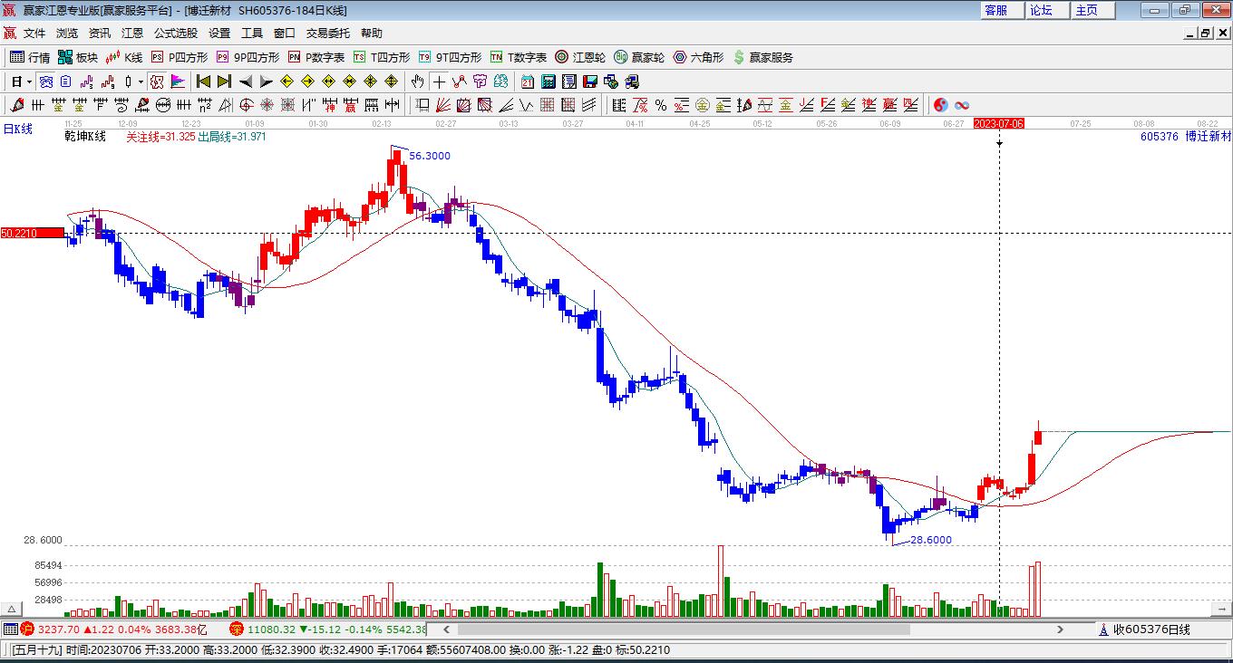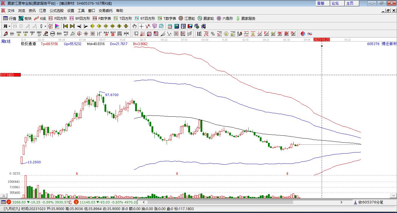 當(dāng)天605376博遷新材最高價(jià)79.68上穿了贏家極反通道工具上方紅色外軌線,受到上方紅色外軌線強(qiáng)力壓制,最終收盤(pán)停留在在上方紅色外軌線與藍(lán)色外軌線上方的超強(qiáng)通道區(qū)域。605376博遷新材近10個(gè)交易