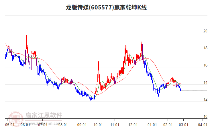 龍版?zhèn)髅?605577)處于贏家江恩多頭次主線形態(tài),從2月10日形成頂分型后持續(xù)下跌,重心下移,今日跌破前低形成短期初次筑頂信號,短期多頭趨勢已被破壞,中長期多頭趨勢依舊保持。龍版?zhèn)髅浇袢仗盏烷_,截