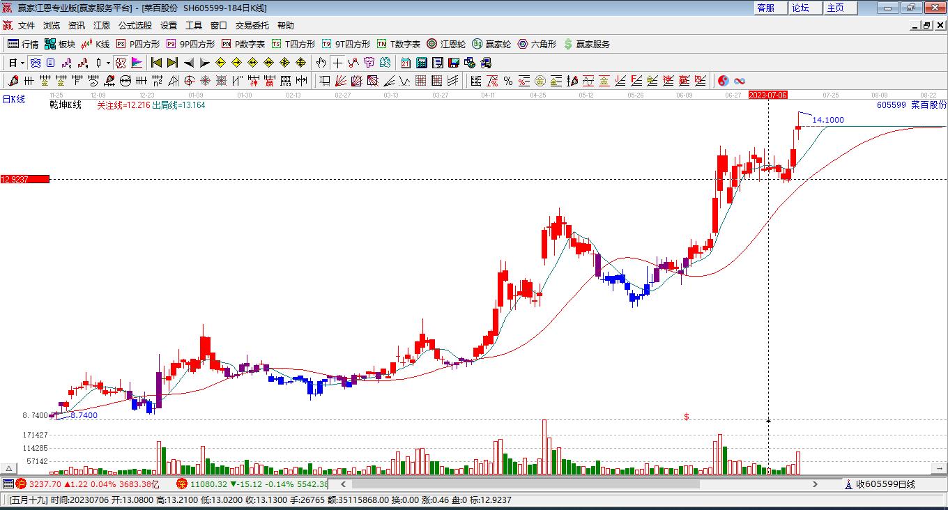 605599菜百股份今日漲停今天股價突破江恩輪中輪內(nèi)循環(huán)重要度數(shù):90度 近35個交易日漲幅59.75%