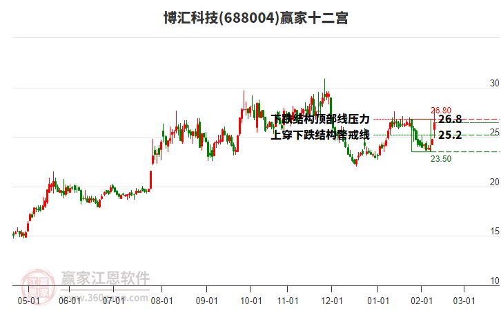 2月13日股價(jià)上穿前期2026年2月6日形成的下跌結(jié)構(gòu)警戒線25.2。依據(jù)贏家十二宮多空能量守恒規(guī)則,下跌結(jié)構(gòu)警戒線是多空能量平衡點(diǎn),突破或跌破往往意味著平衡打破。 今日突破警戒線,多方能量主導(dǎo)上攻,有望在下跌結(jié)構(gòu)頂部線26.8附近將會(huì)形成新的多空能量平衡位。