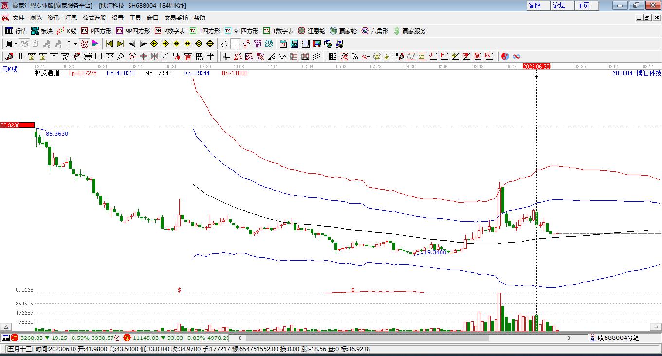 688004博匯科技處于贏家江恩多頭中期回調(diào)形態(tài),1月5日發(fā)出江恩筑底信號后,經(jīng)過18日,今日形成短期筑頂信號,短期多頭趨勢已被破壞,中期多頭反彈趨勢延續(xù),但長期處于回調(diào)中。博匯科技1月23日K線以上