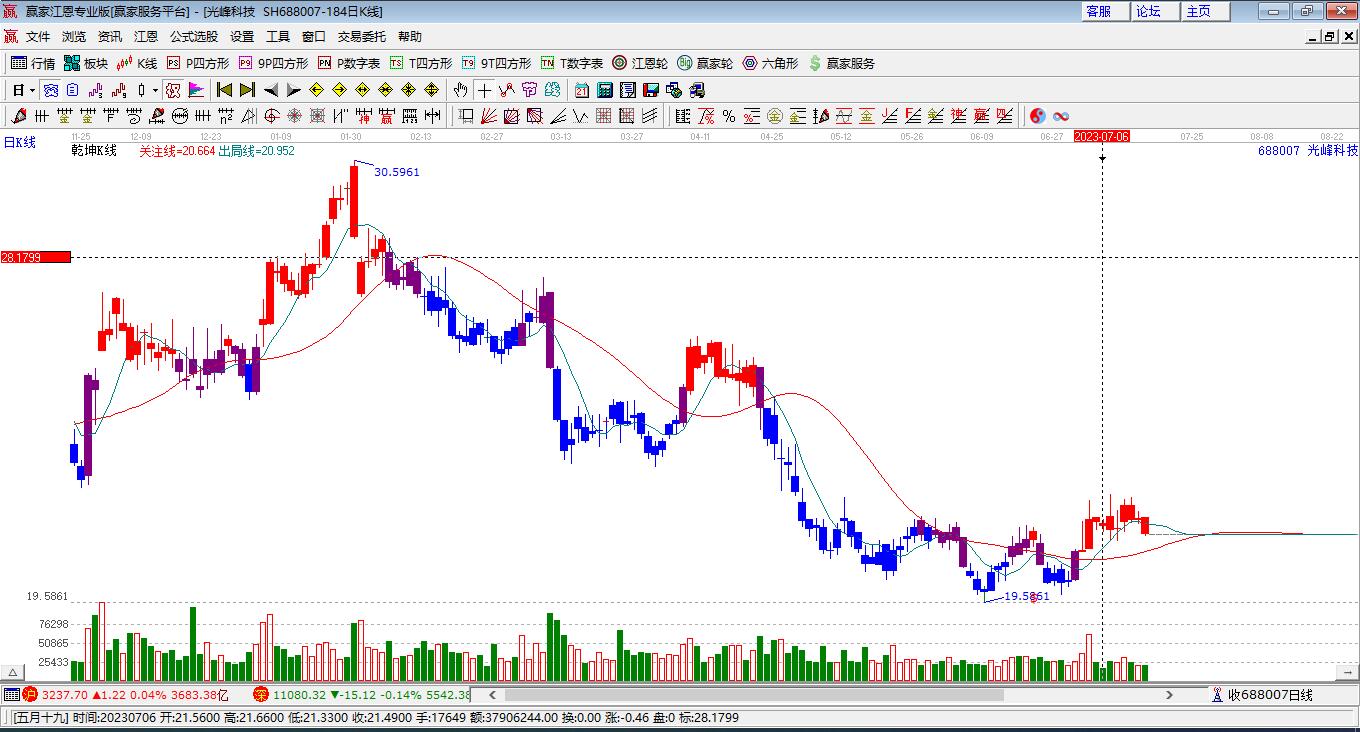 光峰科技處于贏家江恩多頭主線形態(tài),從11月24日形成底分型后持續(xù)上攻,今日突破前高形成初次江恩筑底信號,中長期目前都處于回調中。光峰科技截至目前K線為上下影中陽線,這種K線代表目前上有壓力,下有支撐,