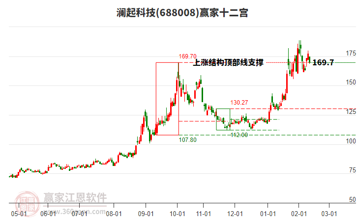 依據(jù)贏家江恩系統(tǒng)趨勢(shì)工具極反通道分析判斷瀾起科技688008運(yùn)行在生命線以上強(qiáng)勢(shì)區(qū)域,根據(jù)規(guī)則該股可短線、波段結(jié)合操作;結(jié)合物極必反的原理通過分鐘圖做盤中差價(jià),應(yīng)用口訣是:生命線上強(qiáng)勢(shì)走,生命線下難抬頭;紅黃兩條外軌線,壓力支撐顯勢(shì)頭。