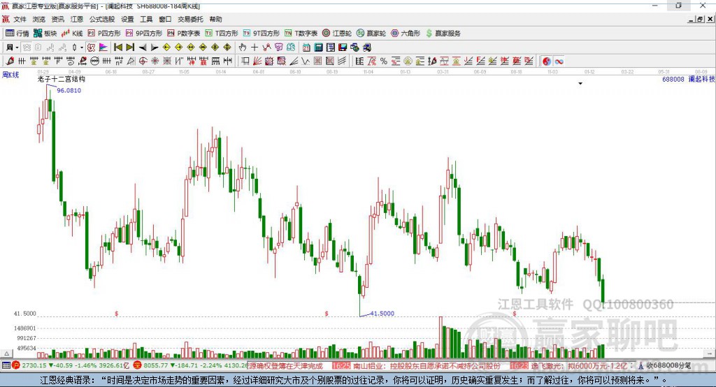 瀾起科技(688008)處于贏家江恩多頭次主線形態(tài),1月5日發(fā)出江恩筑底信號后,經(jīng)過38日,今日形成短期筑頂信號,短期多頭趨勢已被破壞,中長期多頭趨勢依舊保持。瀾起科技截至目前K線為上影小陰線,此K線