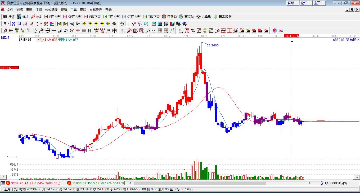 688010福光股份處于贏家江恩多頭次主線形態(tài),11月25日發(fā)出江恩筑底信號后,經(jīng)過65日,今日形成短期筑頂信號,短期多頭趨勢已被破壞,中長期多頭趨勢依舊保持。688010福光股份根據(jù)贏家江恩極反通道