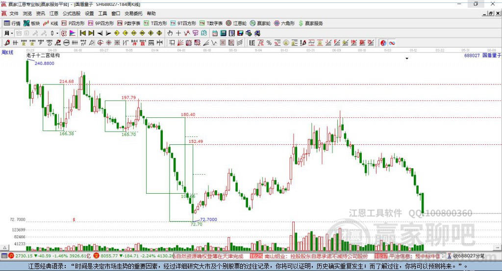國盾量子(688027)處于贏家江恩多頭次主線形態(tài),12月5日發(fā)出江恩筑底信號后,經(jīng)過60日,今日形成短期筑頂信號,短期多頭趨勢已被破壞,中長期多頭趨勢依舊保持。國盾量子今日跳空高開,截止目前K線小陽