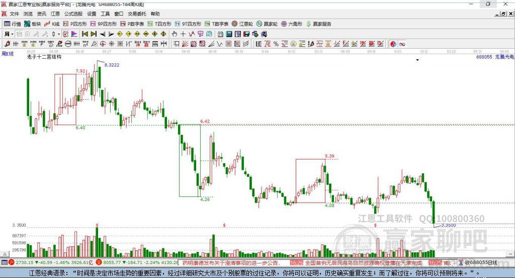 688055龍騰光電處于贏家江恩空頭主線形態(tài),從1月26日形成頂分型后持續(xù)下跌,今日形成短期初次筑頂信號(hào),短期多頭趨勢(shì)已被破壞,中長線均在空頭下跌趨勢(shì)中。龍騰光電今日低開后持續(xù)下跌,截止目前股價(jià)低于昨