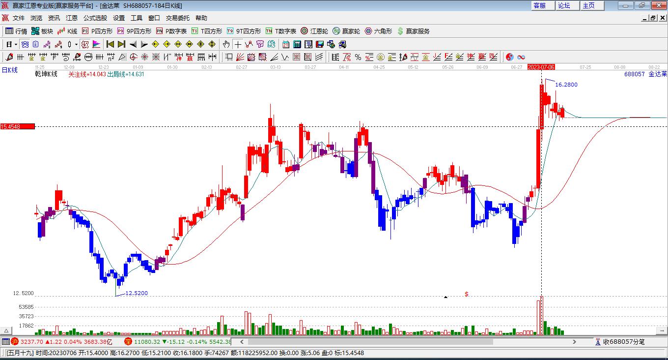 依據(jù)贏家江恩乾坤K線工具展示,本周K線以陰線收盤,目前K線處于紅色區(qū)域,位于關(guān)注線上方,依據(jù)贏家江恩乾坤K線多空模型,目前多頭出局線對當(dāng)前股價形成支撐,短期看多。后市如若股價跌破多頭出局線,則可能形成短期回調(diào)。