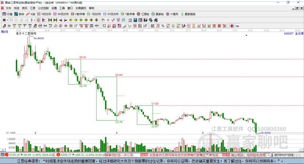 依據(jù)贏家十二宮結(jié)構(gòu)模型工具展示,本周股價處于2023年10月27日形成的下跌結(jié)構(gòu)底部線11.95上方區(qū)域,該股自近期高點13.5跌至本周12.8,跌幅5.47%。依據(jù)贏家十二宮多空能量守恒規(guī)則,若股價不能有效站穩(wěn)底部線,下方多空能量平衡位需結(jié)合前方贏家十二宮結(jié)構(gòu)尋找。