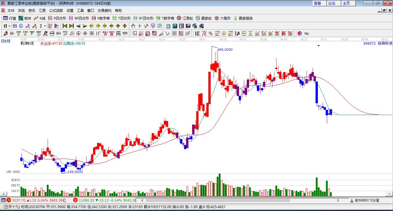 688072拓荊科技處于贏家江恩多頭次主線形態(tài),1月28日發(fā)出江恩筑底信號后,經(jīng)過2日,今日形成短期筑頂信號,短期多頭趨勢已被破壞,中期雖然處于回調(diào)中,但長期多頭趨勢延續(xù)。拓荊科技今日低開,截止目前微