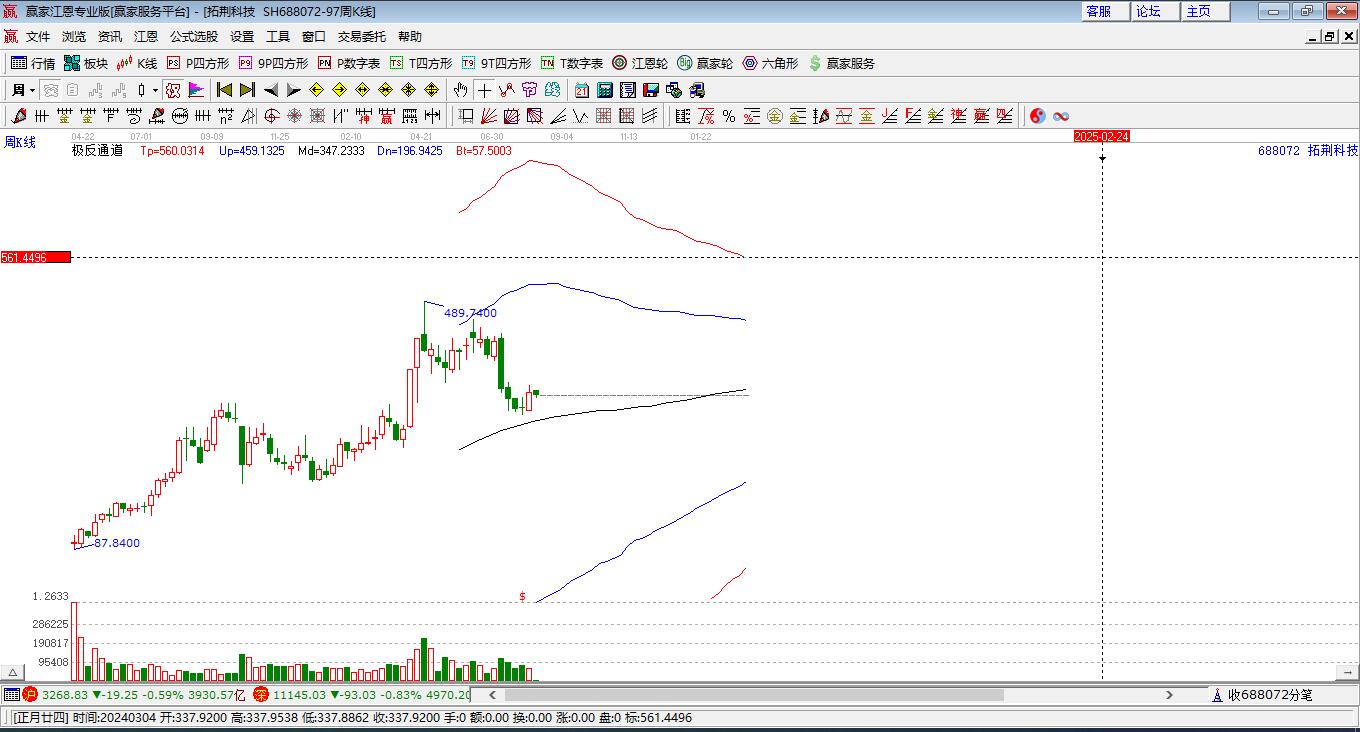 依據(jù)贏家江恩極反通道趨勢工具展示,本周股價處于生命線上強勢通道,本周收盤價325.0,自近期通道內(nèi)高點394.0持續(xù)下跌至本周,到達生命線221.1173點上方,短期關(guān)注此線支撐,如支撐不破,保持在強勢通道內(nèi),波段繼續(xù)看多,有望再次挑戰(zhàn)藍色上軌線。若跌破生命線221.1173,進入弱勢通道,打開下跌空間。