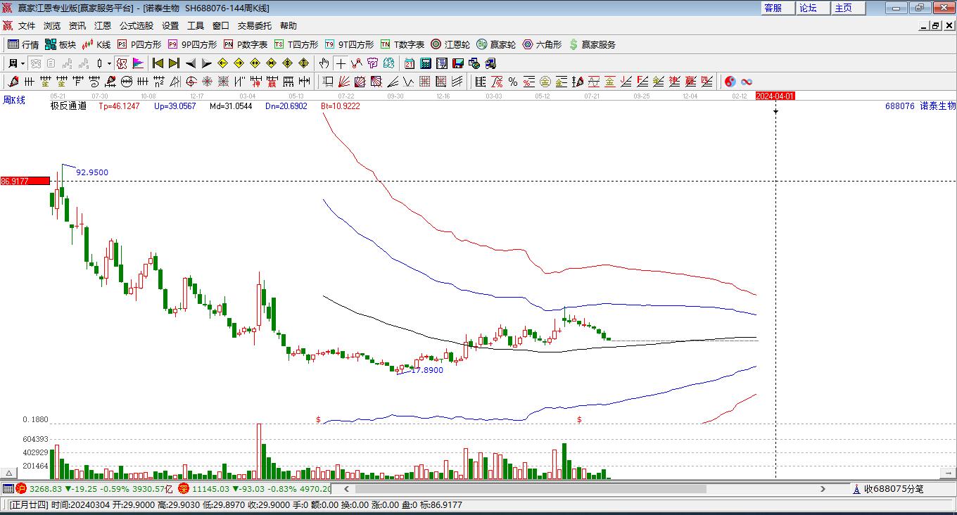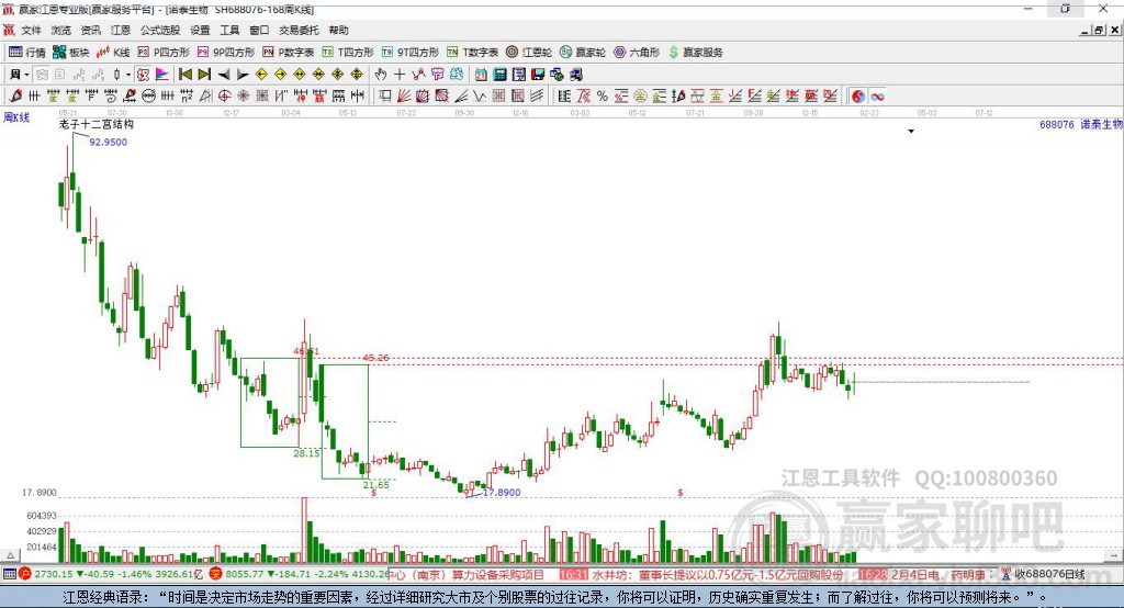 688076ST諾泰處于贏家江恩多頭主線形態(tài),從11月10日形成底分型后持續(xù)上攻,今日突破前高形成初次江恩筑底信號(hào),中期多頭趨勢(shì)延續(xù),但長(zhǎng)期處于回調(diào)中。ST諾泰今日跳空高開(kāi),截止目前K線下影小陽(yáng)線,上