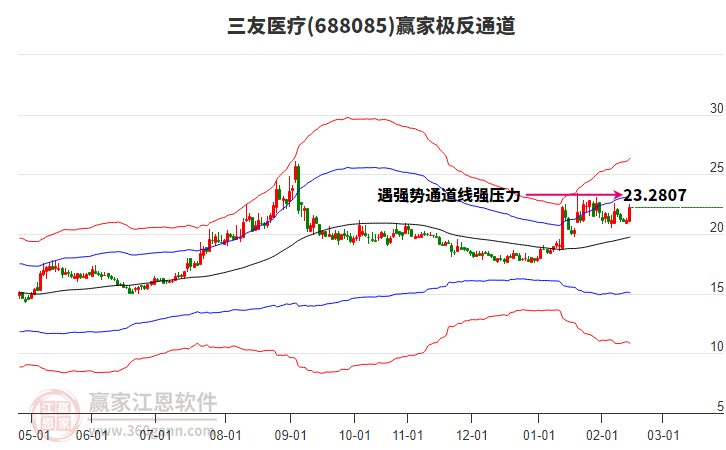 依據(jù)贏家江恩系統(tǒng)趨勢工具極反通道分析判斷三友醫(yī)療688085運(yùn)行在生命線以下弱勢區(qū)域,根據(jù)規(guī)則該股短線輕倉參與,股價跌至弱勢外軌線后波段再結(jié)合其它工具信號建倉。應(yīng)用口訣是:生命線上強(qiáng)勢走,生命線下難抬頭;紅黃兩條外軌線,壓力支撐顯勢頭。