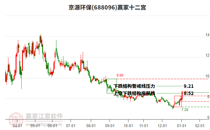 688096京源環(huán)保根據(jù)贏家江恩極反通道趨勢工具展示,上方壓力位9.9053,下方支撐位8.4149。688096京源環(huán)保處于贏家江恩多頭主線形態(tài),從1月30日形成底分型后持續(xù)上攻,今日突破前高形成初