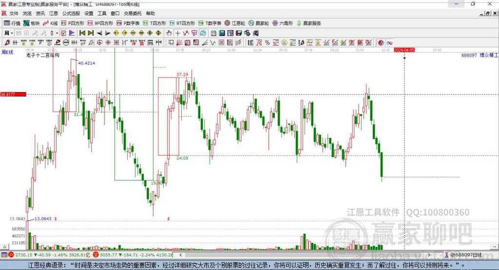 依據(jù)贏家十二宮結(jié)構(gòu)模型工具展示,本周股價(jià)位于前期2022年4月29日形成的下跌結(jié)構(gòu)頂部線48.38與警戒線38.58之間,本周微漲2.14%,以43.5元陽線收盤。依據(jù)贏家十二宮多空能量守恒規(guī)則,下跌結(jié)構(gòu)警戒線是多空能量平衡爭奪點(diǎn),突破或跌破往往意味著平衡打破。本周股價(jià)若能站穩(wěn)警戒線位置,多方能量有望主導(dǎo)上攻,向上頂部線位置尋找多空能量平衡位。如股價(jià)不能有效站穩(wěn)警戒線,則空方能量主導(dǎo)下探,向底部線附近尋找新的多空能量平衡位。