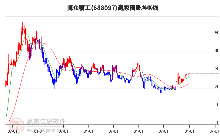 博眾精工處于贏家江恩多頭主線形態(tài),從12月16日形成底分型后持續(xù)上攻,今日突破前高形成初次江恩筑底信號,中期多頭趨勢延續(xù),但長期處于回調(diào)中。博眾精工今日跳空高開,小幅上漲7.54%,呈現(xiàn)上漲走勢。