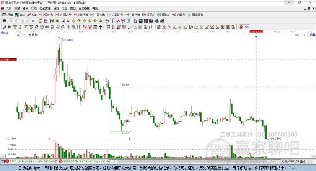 依據贏家江恩乾坤K線工具展示,目前股價處于關注線下方,本周K線以陽線收盤,收盤價處于出局線下方,近期1月23日出現高點,12月19日出現低點,近期圍繞關注線震蕩,近3周出現短線下行,依據贏家江恩乾坤K線工具展示,工具顯示依舊短線看空。