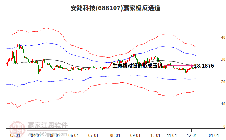 依據(jù)贏家江恩系統(tǒng)趨勢工具極反通道分析判斷安路科技688107運行在生命線以下弱勢區(qū)域,根據(jù)規(guī)則該股短線輕倉參與,股價跌至弱勢外軌線后波段再結合其它工具信號建倉。應用口訣是:生命線上強勢走,生命線下難抬頭;紅黃兩條外軌線,壓力支撐顯勢頭。