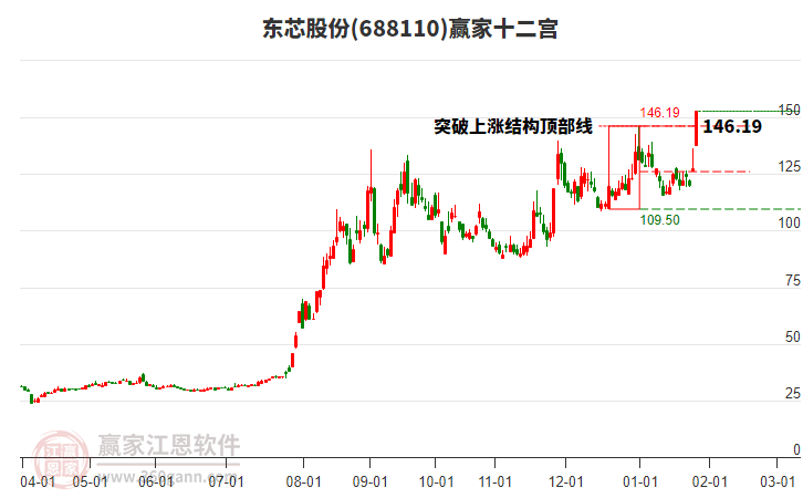 688110東芯股份處于贏家江恩多頭次主線形態(tài),12月29日發(fā)出江恩筑底信號后,經(jīng)過24日,今日形成短期筑頂信號,短期多頭趨勢已被破壞,中期雖然處于回調(diào)中,但長期多頭趨勢延續(xù)。東芯股份今日雖高開,截止