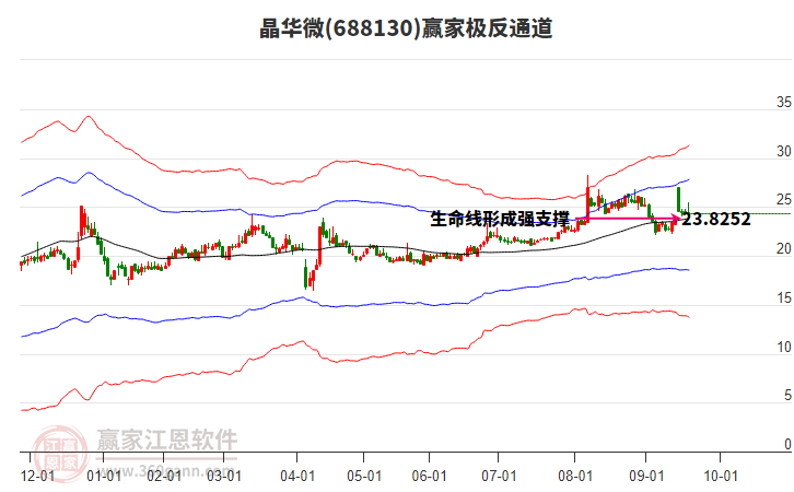 依據贏家江恩系統(tǒng)趨勢工具極反通道分析判斷晶華微688130運行在生命線以下弱勢區(qū)域,根據規(guī)則該股短線輕倉參與,股價跌至弱勢外軌線后波段再結合其它工具信號建倉。應用口訣是:生命線上強勢走,生命線下難抬頭;紅黃兩條外軌線,壓力支撐顯勢頭。
