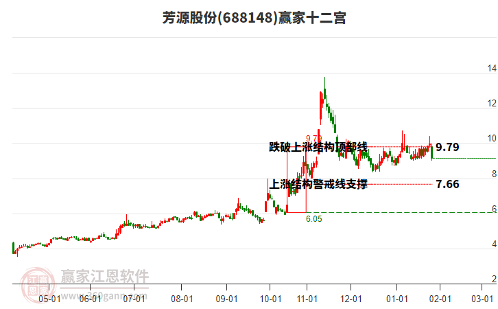 688148芳源股份處于贏家江恩多頭中期回調(diào)形態(tài),今日重心下移,形成短期筑頂信號,6月26日發(fā)出中期江恩筑底信號后,經(jīng)過215日,今日形成中期筑頂信號,若持續(xù)下跌,觸發(fā)長期筑頂信號,688148芳源股